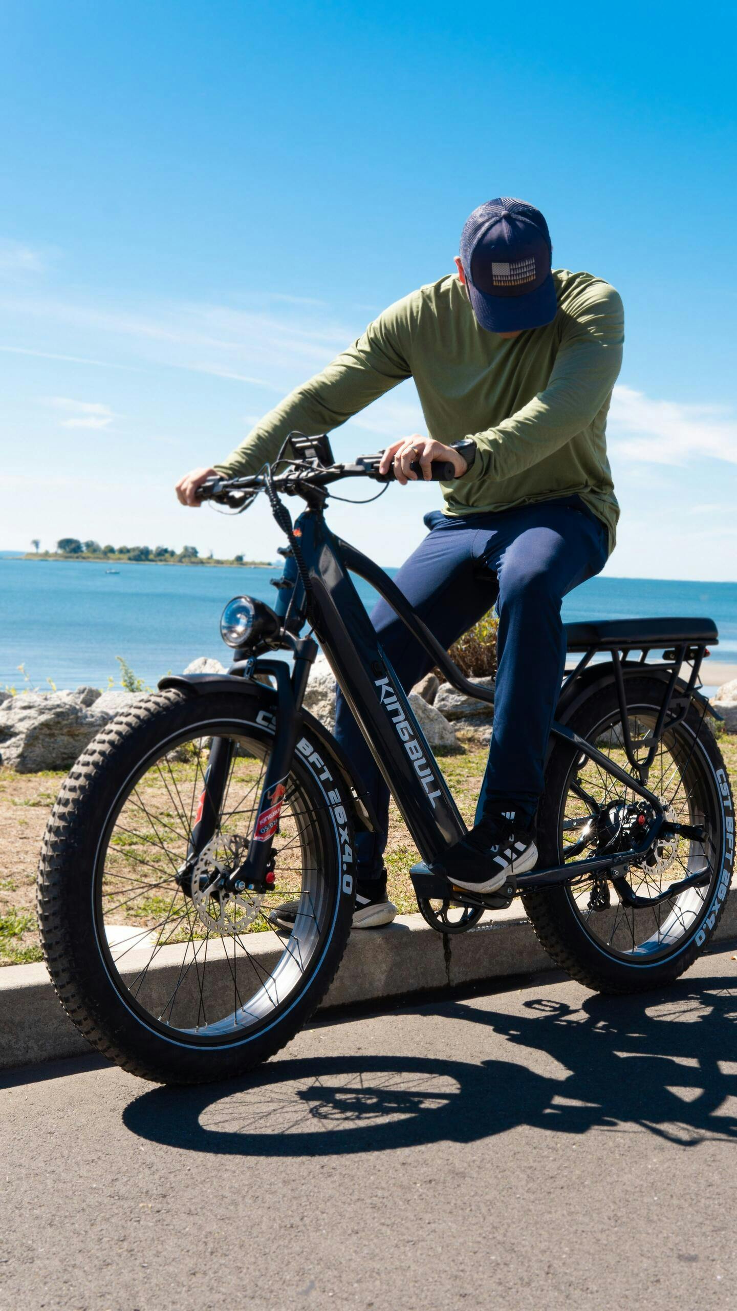 A man riding a Kingbull electric bike on a paved road. A man riding a Kingbull electric bike on a paved road.